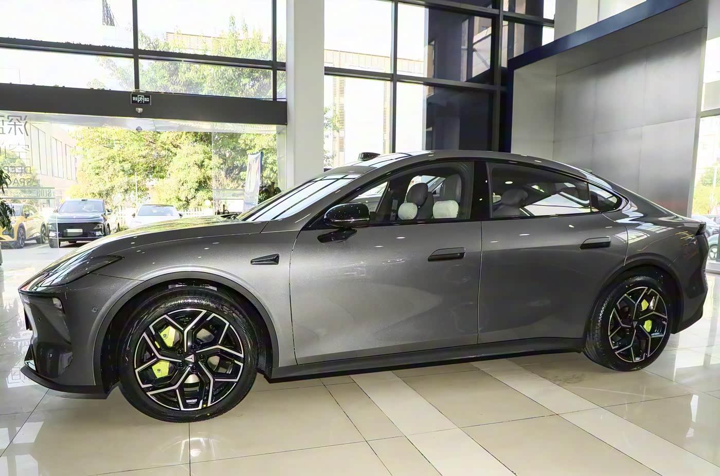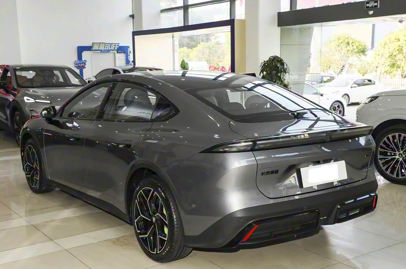 再来看车身侧面部分,车身侧面是深蓝 L06 的点睛之笔,4830/1905/1480mm 的长宽高搭配 2900mm 超长轴距,在中型车中优势明显,甚至比比亚迪秦 L 轴距多出 110mm。上扬的腰线从车头贯穿至车尾,勾勒出 “前低后高” 的蓄势姿态,溜背式车顶线条如液态金属般流畅延伸,既营造出纯粹轿跑质感,又未过度牺牲头部空间。无框车门与半隐藏式门把手的组合堪称年轻人 “心头好”,门把手靠近时自动弹出,离开后自动缩回,仪式感拉满的同时,让车身侧面更显简洁顺滑。实拍车型搭载的 19 英寸花瓣式轮毂,搭配荧光绿刹车卡钳,进一步强化运动氛围,而丰富的车身颜色选择,也能满足不同用户的个性化需求。
