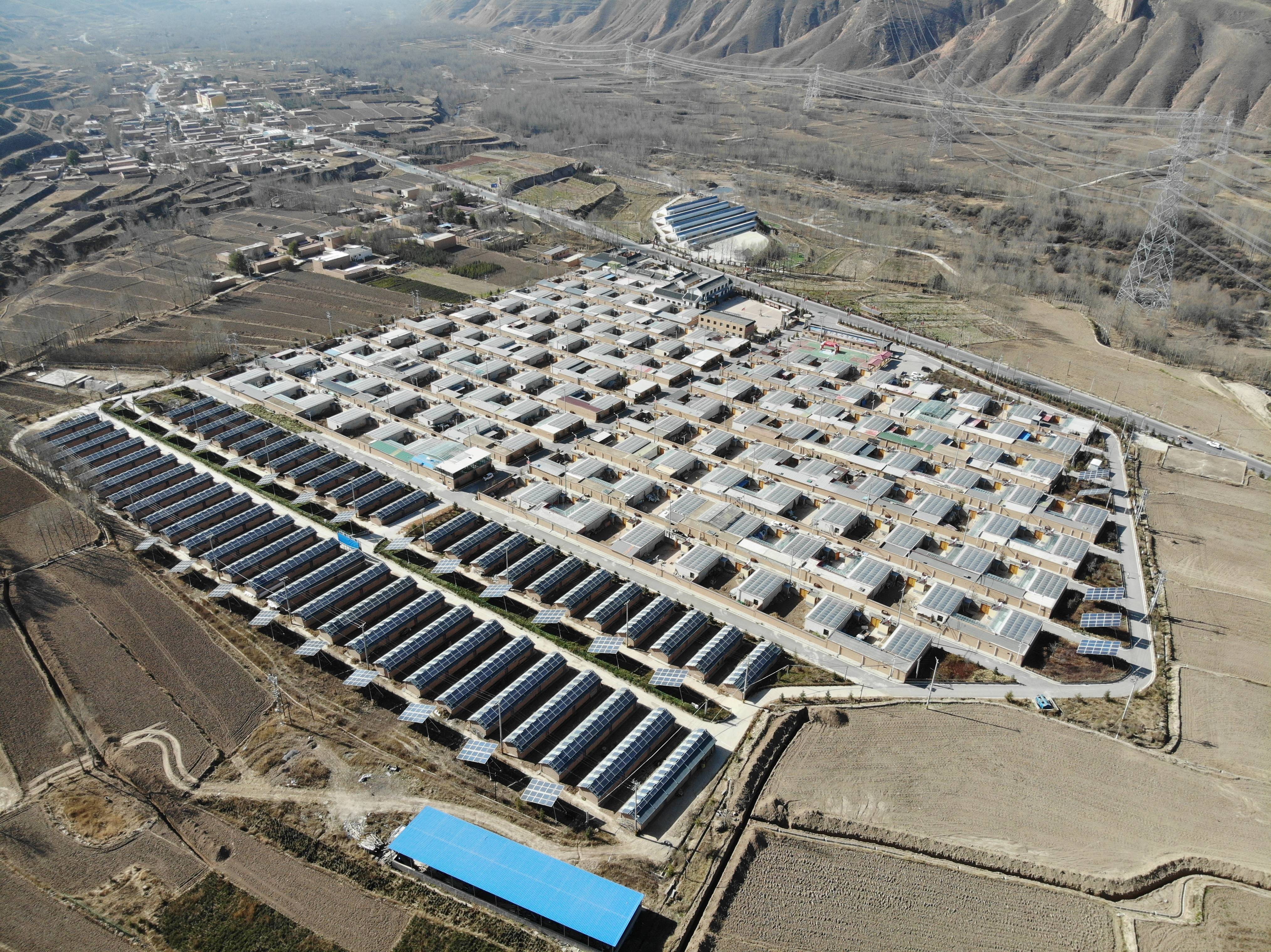 班彦新村全貌(无人机照片)。新华社记者 戴天放 摄“这屋顶现在可是个宝!日头足的时候,家里用电都靠它。”村民吕志平指向自家屋顶的光伏板说,村里建设微电网项目后,电费省了一大截,每月电费只需要30多元。