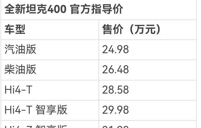 11月6日,坦克品牌官方宣布全新坦克400迎来正式上市,新车共推出5款车型,售价区间24.98-31.98万元。同时,官方推出多重上市权益。新车新增“敦煌紫”车色,并增加Hi4-Z动力和激光雷达,以提升整体竞争力。