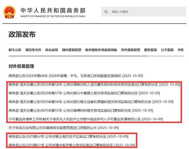 中国商务部连续发布七条公告,宣布对稀土及相关技术、超硬材料、锂电池关键原料等物项实施出口管制,还宣布任何使用中国技术或设备的海外企业出口均需中方许可,完美复刻美国芯片封锁逻辑。